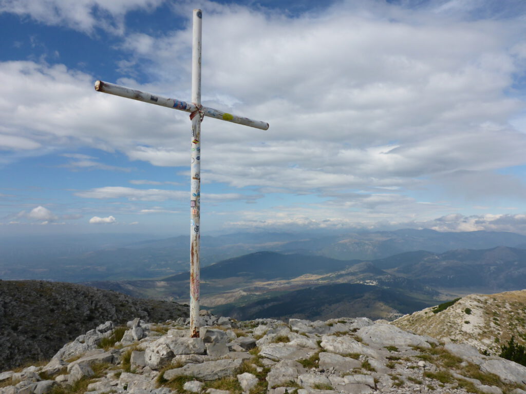 Ein großes Kreuz und ein roter Gipfelpavillon (oft auch mit Buch) zieren den Gipfel. Der Blick reicht weit und bei gutem Wetter ist der Perucko-See und sogar der Velebit-Gebirgszug zu erkennen.