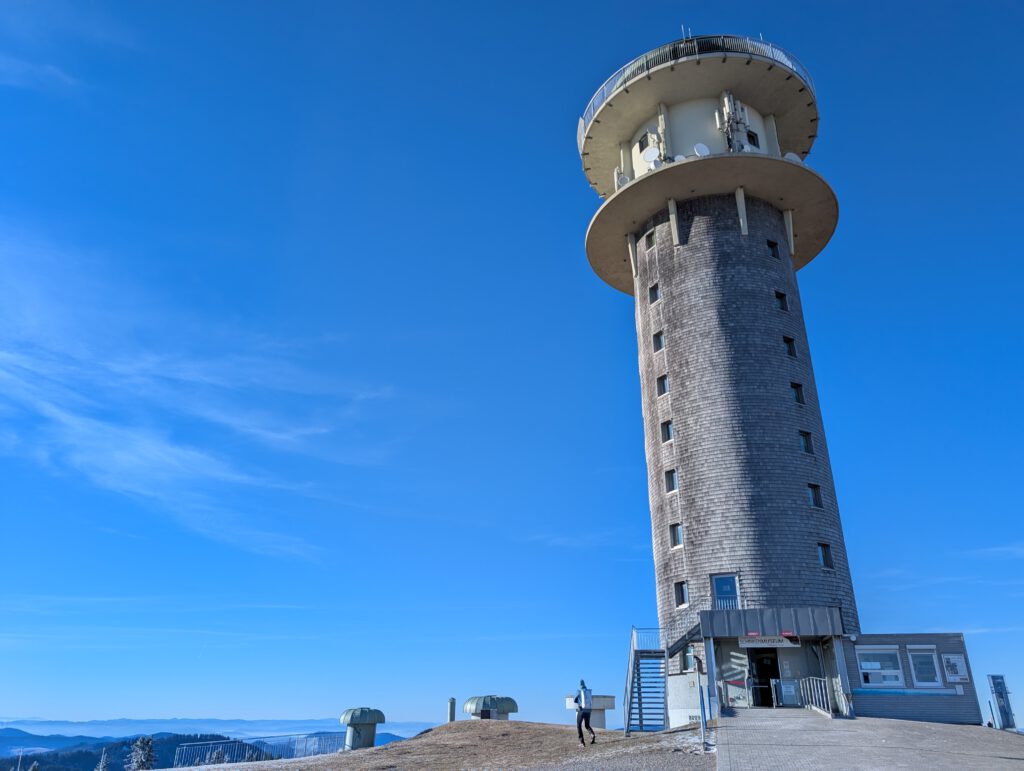Mit unserer Hochschwarzwaldcard können wir kostenlos den Turm besteigen. Mittels Fahrstuhls geht es bequem ganz hinauf zur Aussichtsterrasse. Der Ausblick ist fantastisch. Schilder zeigen die Namen der Berge, die man von hier aus sehen kann. Mont Blanc, Eiger-Mönch-Jungfrau und unzählige andere berühmte Berge zeigen sich am Horizont. Im Sommer befindet sich hier übrigens das höchstgelegene Trauzimmer Baden-Württembergs – man kann im 11. Stock des Turms auf über 40 Metern Höhe heiraten.