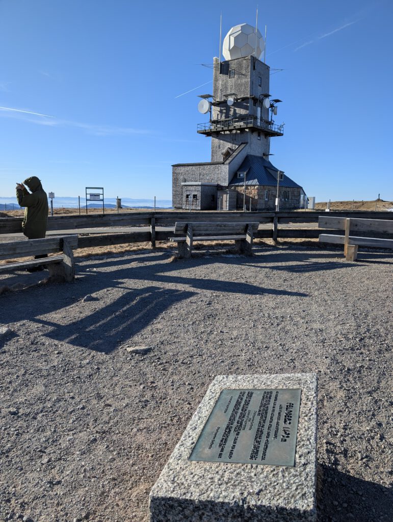 Auf einer Infotafel erfahren wir, dass die Jahresmitteltemperatur auf dem Feldberg 3,3 Grad beträgt und damit der Nordnorwegens entspricht. Das ist insofern interessant, als dass sich nur 30 Kilometer entfernt der Kaiserstuhl befindet, eine der wärmsten Regionen Deutschlands. Auf dem Feldberg hingegen liegt oft bis in den Juli hinein Schnee. Und es kann stürmisch sein. Das können wir bestätigen. Der Wind ist bissig kalt – sehr lange halten wir es hier leider nicht aus.