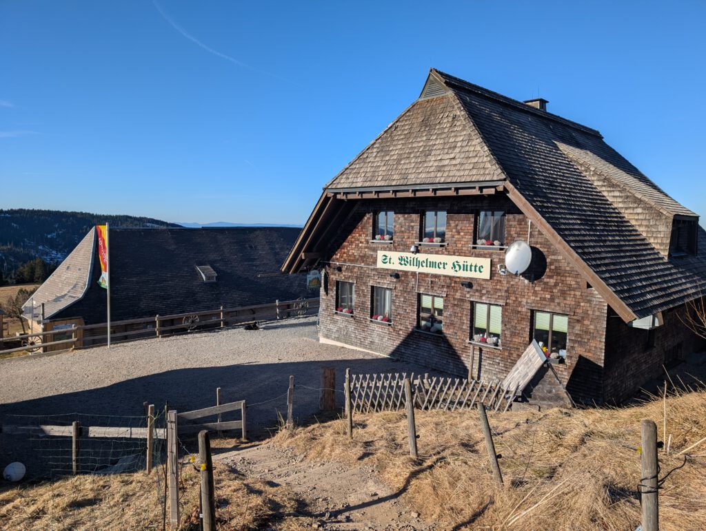 Vorbei an einer Wetterstation folgen wir den Schildern St. Wilhelmer Hütte. Über einen erdigen Pfad geht es zügig hinab und schon erreichen wir die urige Unterkunft auf 1390 Metern.