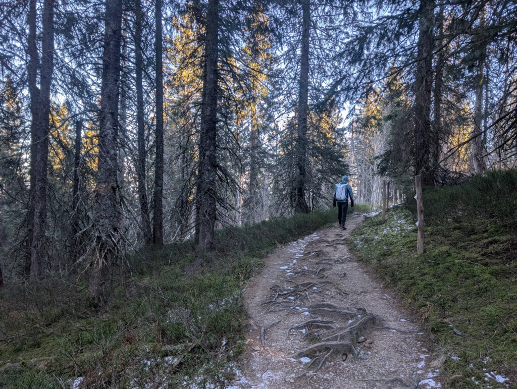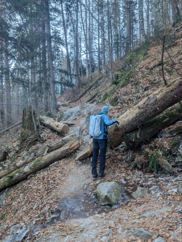 Wir halten uns links und steigen nun wieder zunehmend steil bergauf. Hier im Wald ist es schattig und der Weg immer wieder vereist.