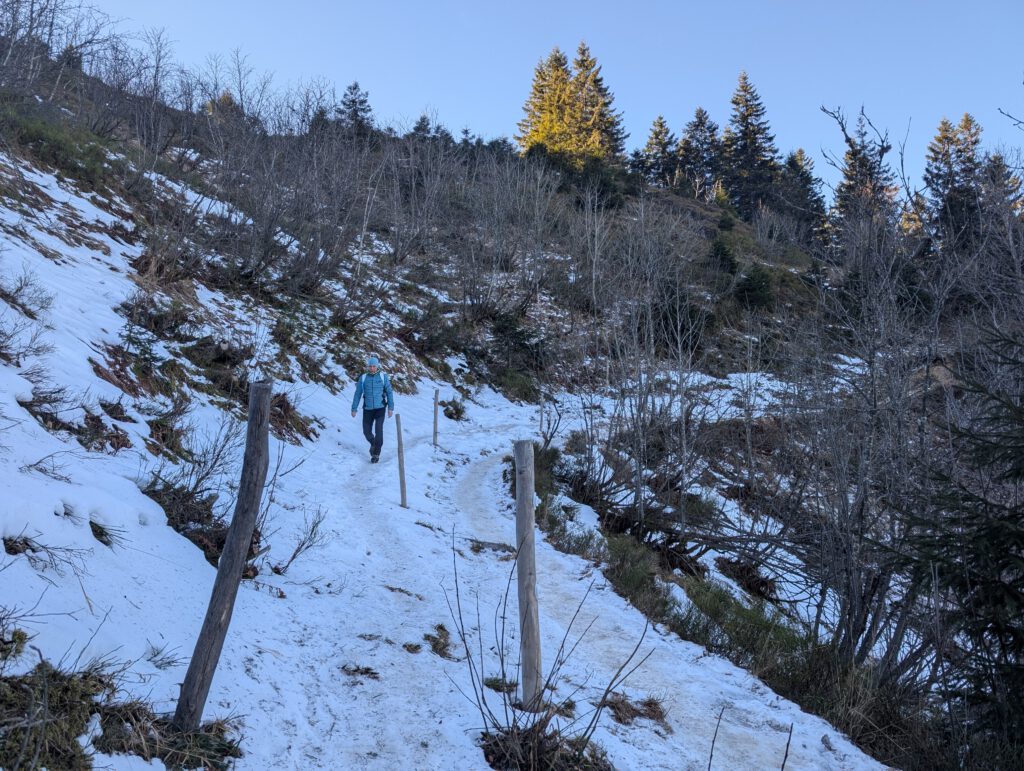Ein schöner Pfad schlängelt sich den jetzt etwas steileren Hang hinauf. Mit jedem Höhenmeter wird der Ausblick besser, es hat einige Minusgrade heute aber der Himmel ist blau und die Sicht reicht kilometerweit bis zu den Schweizer Alpen.