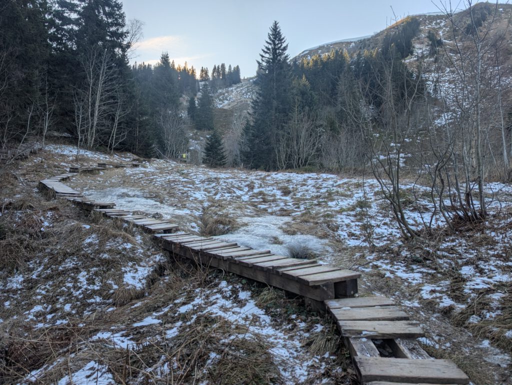 Wir steigen steil hinab und passieren einen Bohlensteg, der im Sommer über die Flachmoore hinweghilft. Jetzt ist der Boden zugefroren und man muss eher aufpassen, auf den Holzdielen nicht auszurutschen.