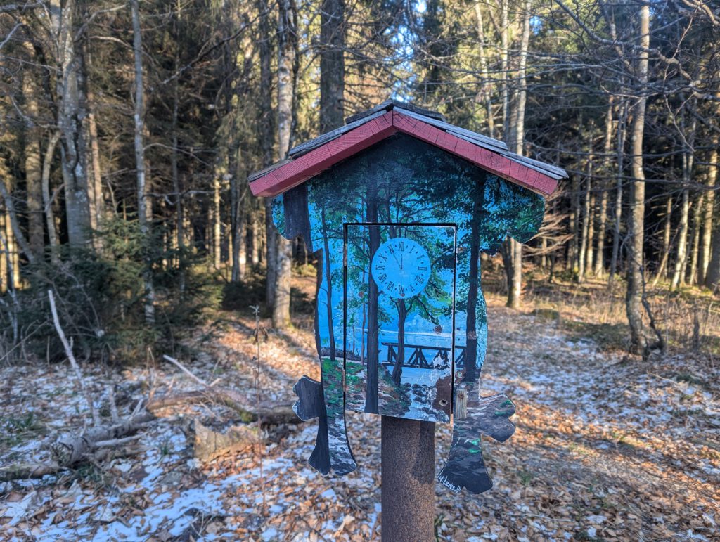 Im Sommer führt der Wanderweg kurz darauf rechts in den Wald hinein und kürzt somit eine größere Schleife ab. Im Winter ist hier Ruhezone für die Tiere und somit müssen wir mehrmals einen Umweg laufen. Mitten im Wald steht am Wegesrand plötzlich eine Art Kuckucksuhr, sie hat einen Wanderstempel in ihrem Kästchen.