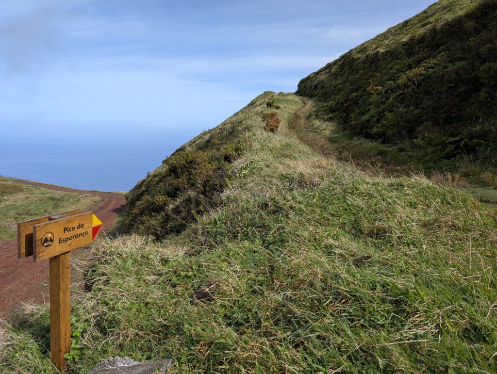 Wir folgen dem Wanderschild „Fajãs de Ouvidor“ auf einer breiten Piste. Der sandige Weg ist gut mit dem Auto befahrbar, ein paar Fahrzeuge kommen uns sogar entgegen. Wir passieren nach einem Brunnen die Nordflanke des Pico do Pedro. Immer wieder zeigen Schilder die Namen der Berge an, die man gerade passiert. Wanderwege führen allerdings nicht auf die Gipfel.