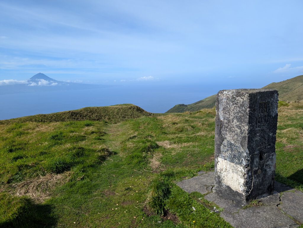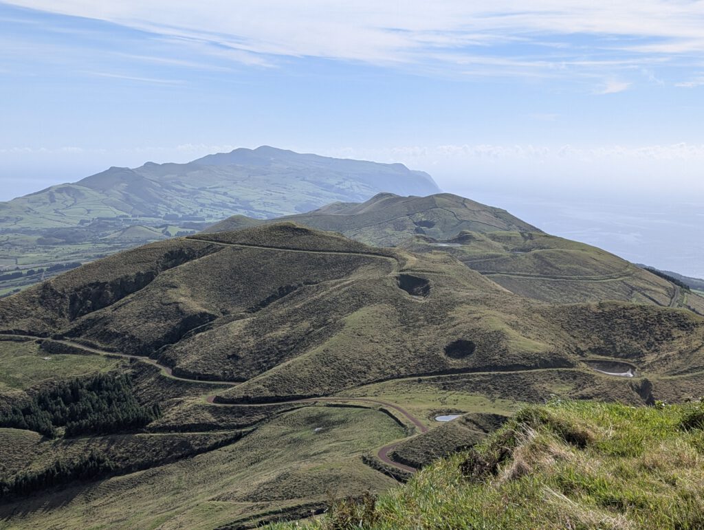 Doch auch der Blick über die langgestreckte Insel ist einmalig. Wir sehen zahlreiche Vulkankegel und grüne Wiesen. Auch die Nachbarinseln Graciosa und Terceira sind zu erkennen.