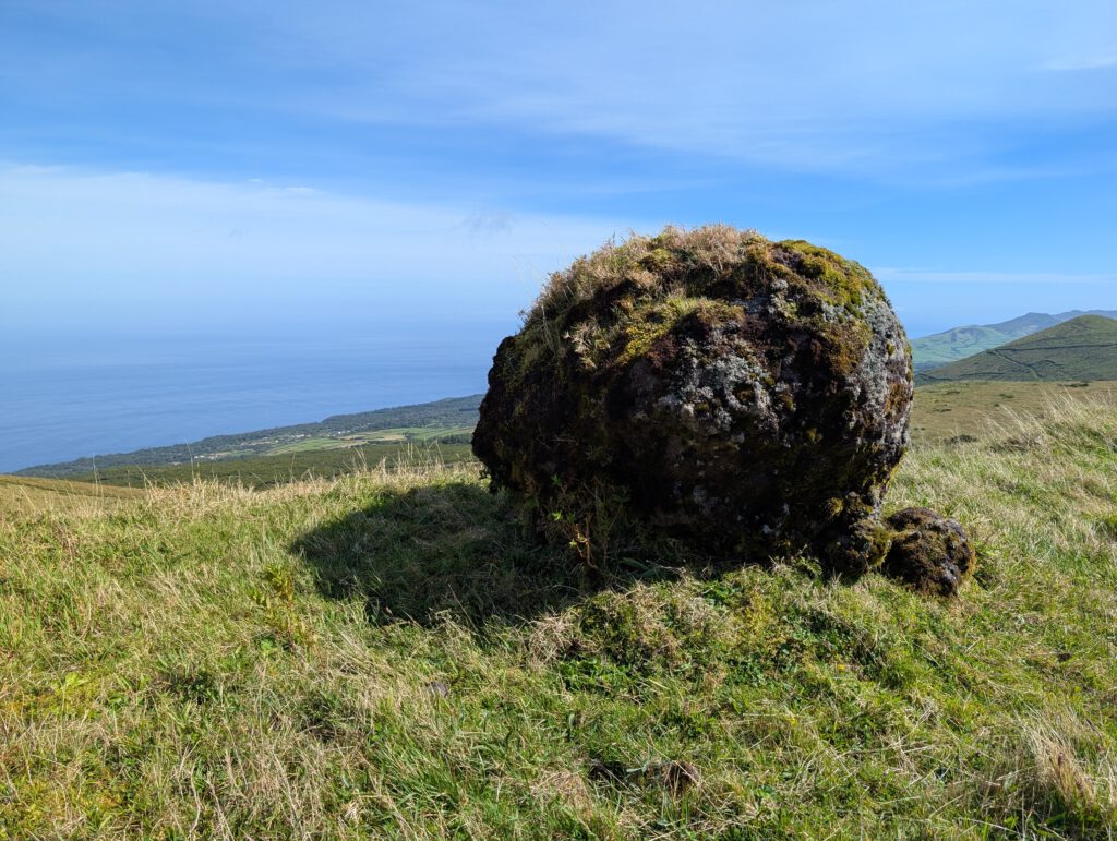 Wir folgen unserem Track aus dem Rother-Guide Azoren nach links und bleiben immer auf der sandigen Piste. So passieren wir noch den Pico do Areiro und den Pico Pinheiro. Interessante Kugeln liegen am Wegesrand.