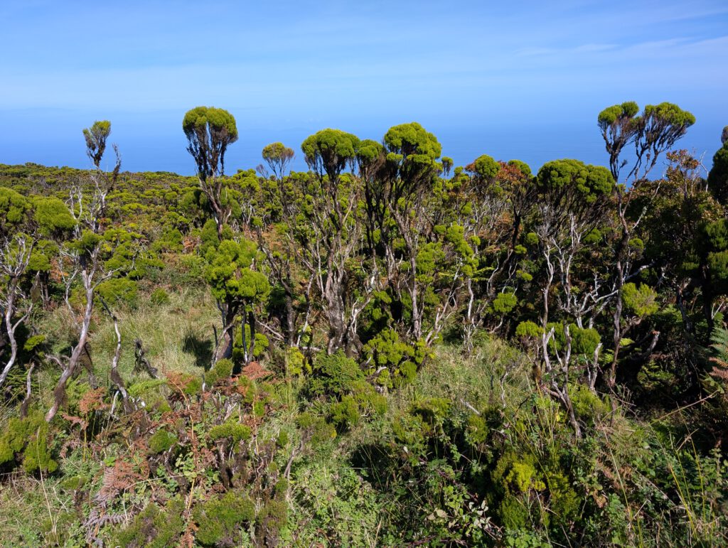 Dann, kurz nach dem Pico Pinheiro, erreichen wir eine Weggabelung und biegen nun scharf links ab. Was wir bis hierhin gelaufen sind, müssen wir alles noch zurück. Das ist uns schon klar. Zunächst führt der Weg malerisch durch mannhohes Azoren-Heidekraut.