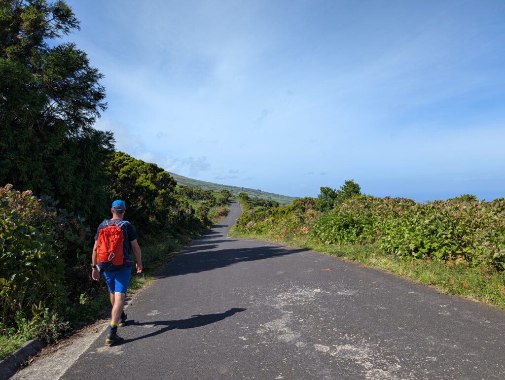 Wir gönnen uns jetzt nochmal eine Pause und begeben uns dann an den Endspurt. Denn da wir zum Auto zurückmüssen, können wir nicht zur „Fajãs de Ouvidor“, wie im Rother empfohlen, absteigen. Wir lassen den Abzweig hinab also rechts liegen und folgen der nun geteerten Straße immer gerade aus.