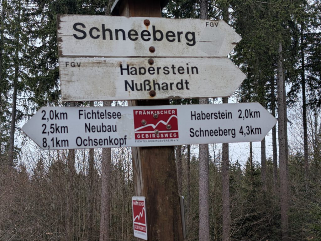 Der Wegweiser zeigt gleich drei unserer heutigen Ziele an. Denn neben dem geschichtsträchtigen Schneeberg wollen wir noch zum Haberstein und Nußhardt-Gipfel. Gegen Ende der gut 13 Kilometer langen Rundtour wartet noch eine urige Einkehr auf uns.