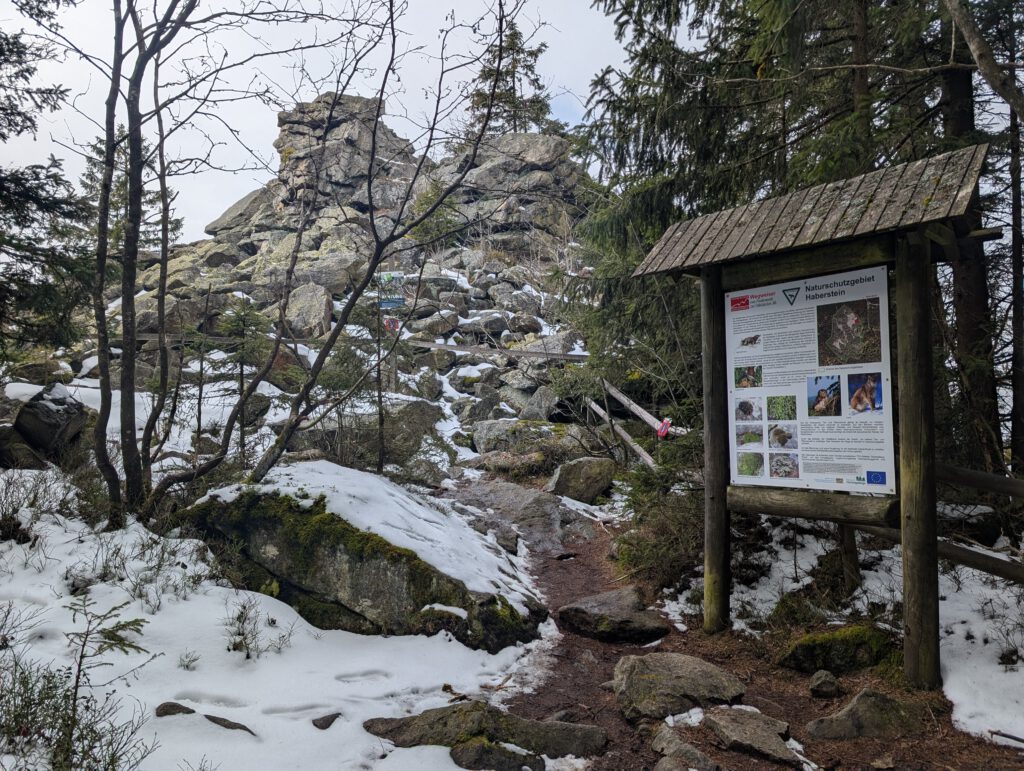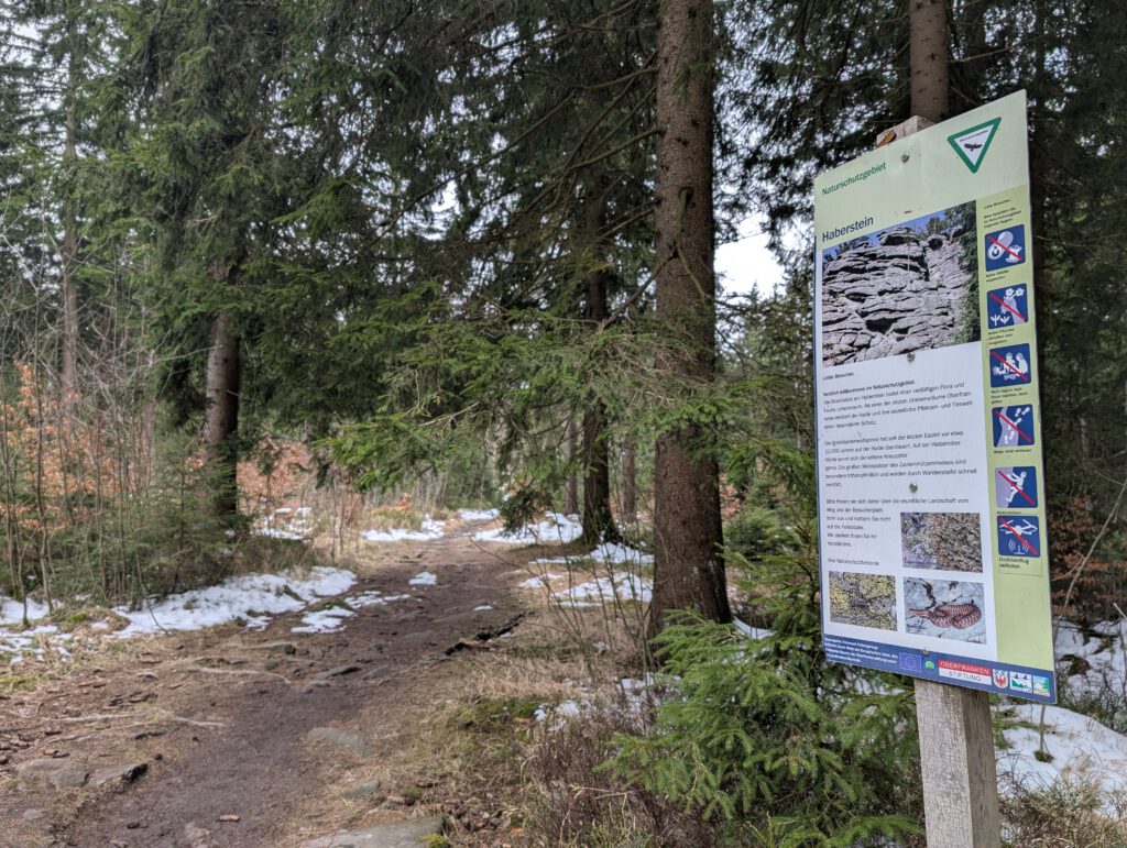 Wir erreichen eine Kreuzung, ein Wegweiser zeigt nach links den Abstecher zum 927 Meter hohen Haberstein an.