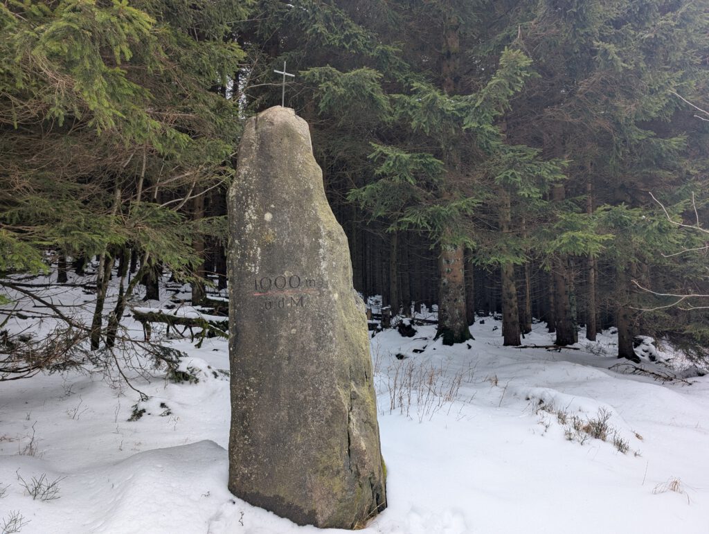 Dann passieren wir rechter Hand den 1000 Meter-Stein mit kleinem Gipfelkreuz.