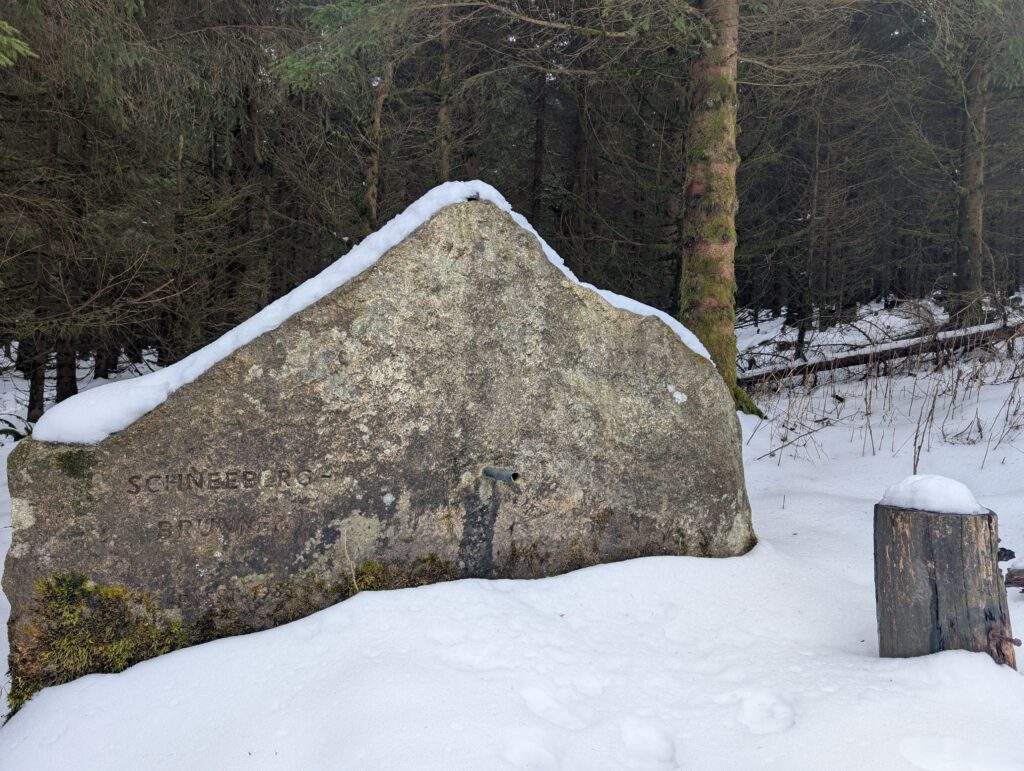 An einer Kreuzung halten wir uns rechts. Auf der linken Seite sehen wir den eingeschneiten Schneebergbrunnen.