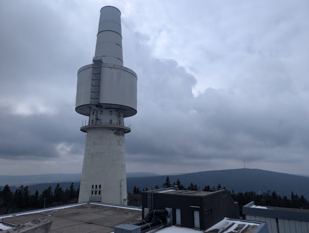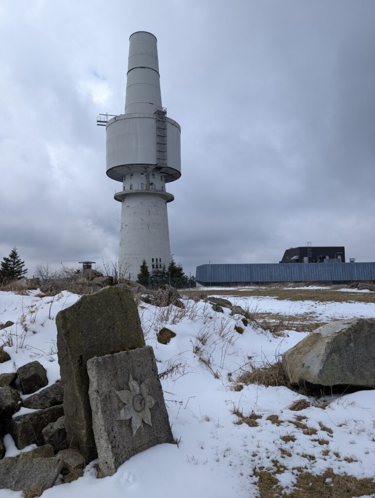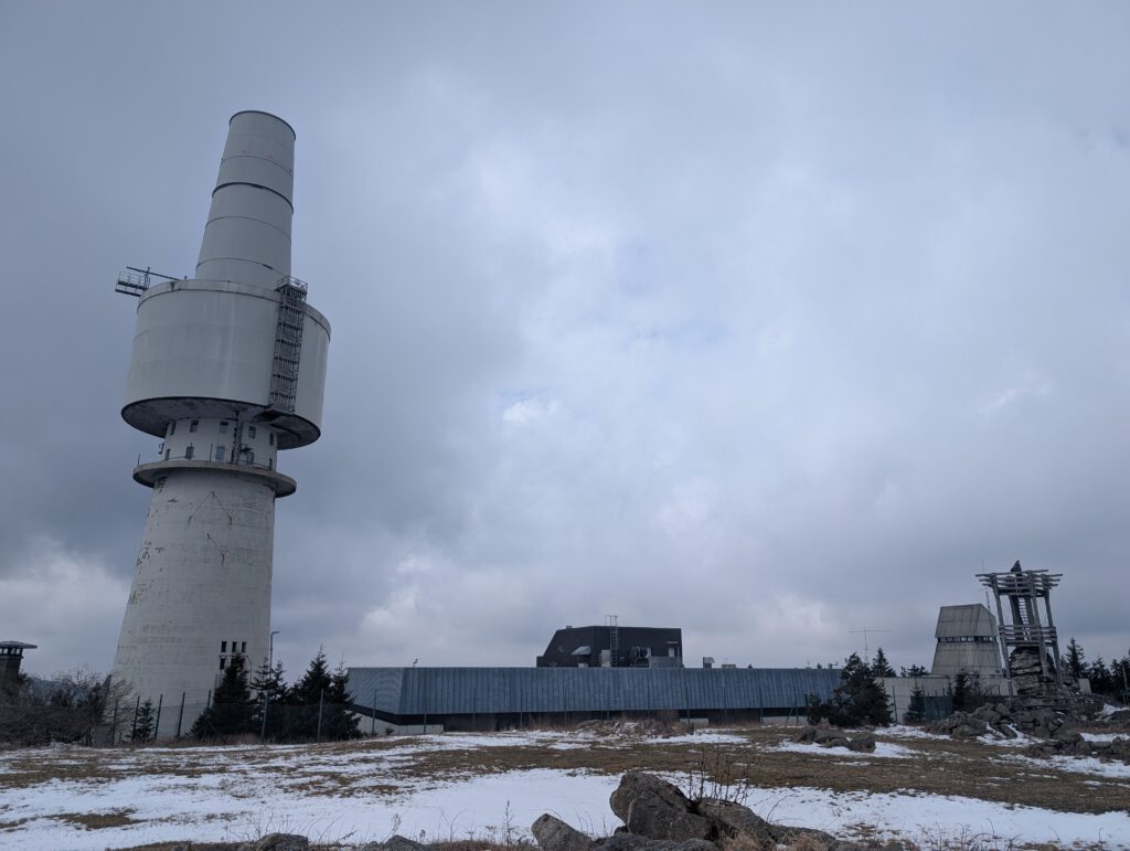 Ein markanter Betonturm thront direkt auf dem Gipfel. Seinetwegen ist der Schneeberg auch aus dem Tal immer gut zu erkennen. Die Bundeswehr ließ den 78 Meter hohen Fernmeldeturm mit seinen zahlreichen Nebengebäuden im Kalten Krieg bauen. Fast 50 Jahre war der Gipfel militärisches Sperrgebiet. Erst seit 1996 ist er wieder für Wanderer zugänglich.