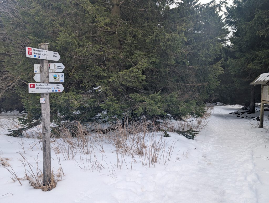 Wir überqueren den Gipfel und folgen den Wanderschildern nach rechts Richtung Nußhardt/Seehaus.