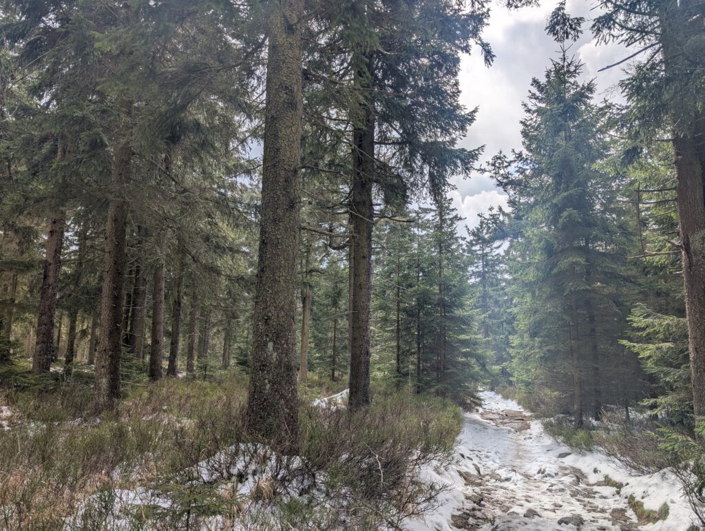 Für unseren Weiterweg gehen wir das kurze Stück zurück zur Kreuzung und folgen dem Wegweiser „Schneeberg“. Schon früh im Jahr fällt hier in der Region Schnee und bleibt meist lange liegen. Und ja: Je höher wir kommen, desto höher der Schnee. Es ist Ostern, im Tal blühen die Blumen, hier ist noch Winter.