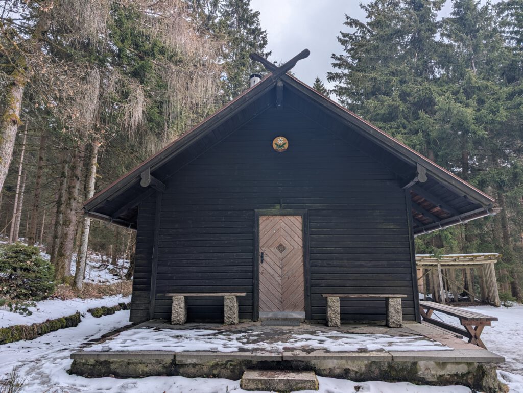 Angekommen an einer Schutzhütte des Fichtelgebirgsvereins, gibt es ein paar Bänke und Tische. Im Wald steht sogar ein Holzklo. Die Sonne hat sich durchgerungen und verwöhnt uns mit ein paar wärmenden Strahlen – der perfekte Ort für eine Pause.