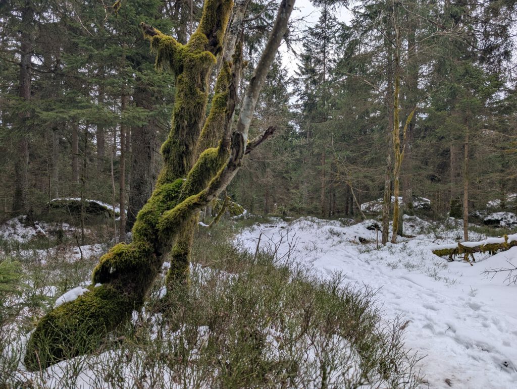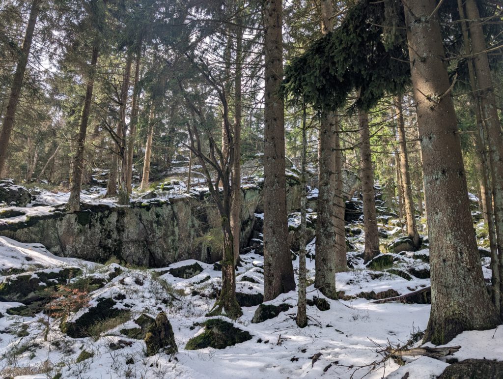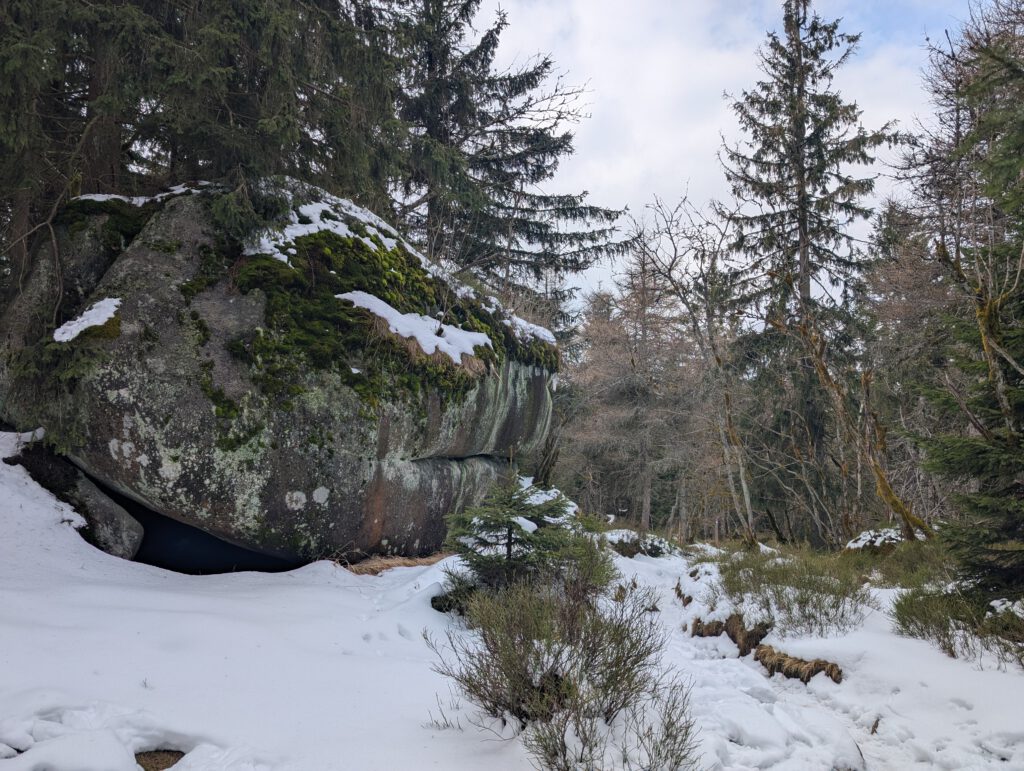 Moos wächst an den Bäumen und immer wieder passieren wir interessante Steinformationen im Wald.